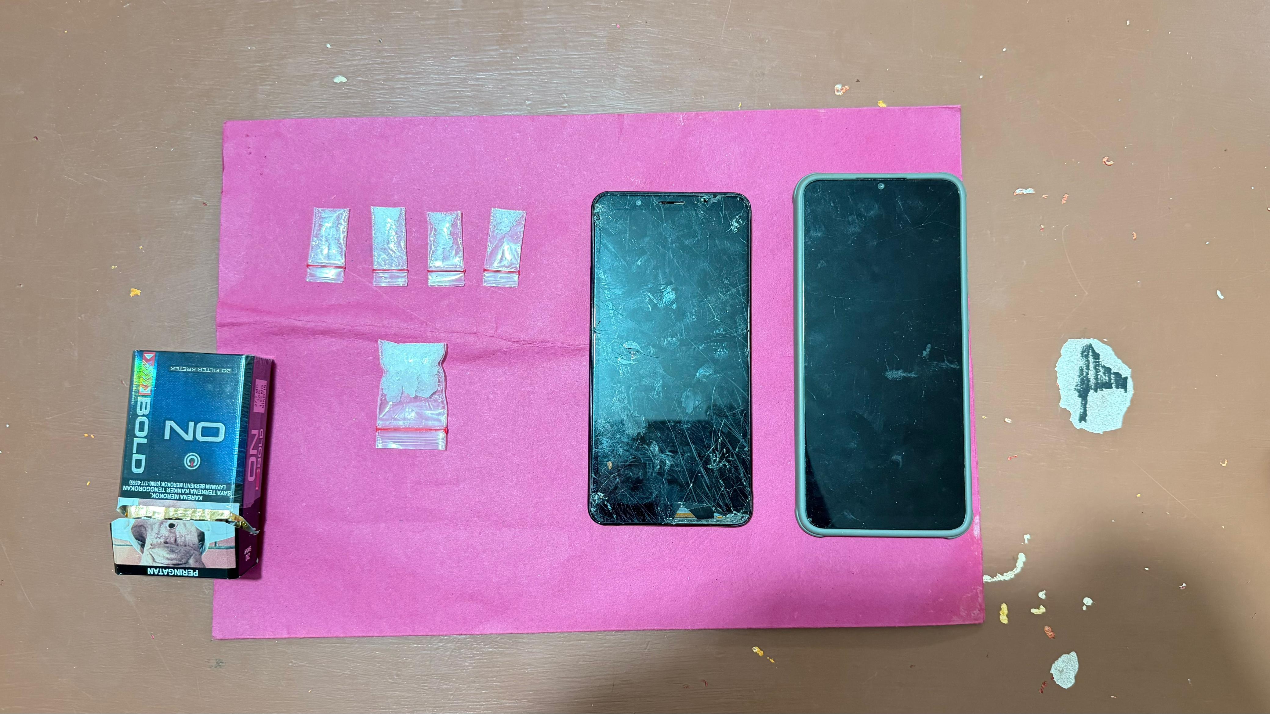 Adapun total barang bukti yang berhasil diamankan dalam kasus ini meliputi satu paket besar dan empat paket kecil diduga narkotika jenis sabu, dua unit handphone masing-masing merek Vivo warna hitam dan Samsung warna putih, serta satu bungkus rokok merek On Bold.
