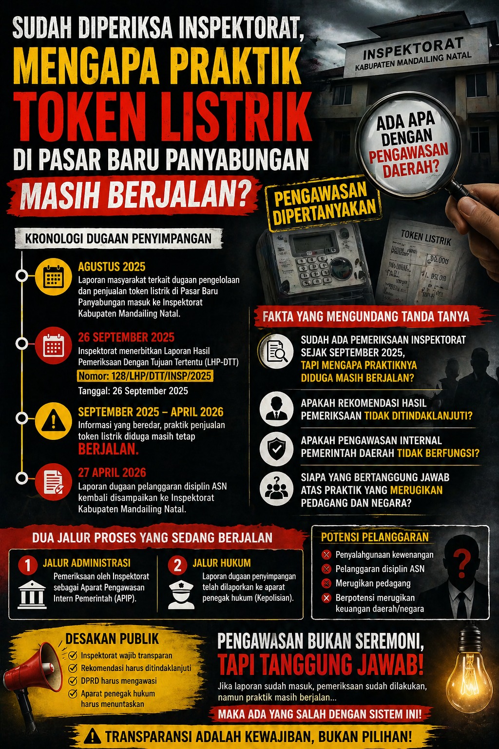 Mandailing Natal – SuaraXPost - Polemik dugaan praktik penjualan token listrik di lingkungan Pasar Baru Panyabungan kini memunculkan pertanyaan serius terhadap efektivitas pengawasan internal pemerintah daerah.